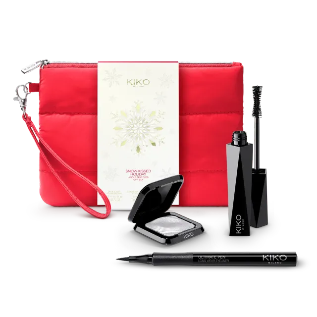 Подарочный набор для макияжа глаз, в который входят тушь для ресниц, придающая объем, черная подводка для глаз и тени для век цвета металлик, упакованные в очень классную косметичку.